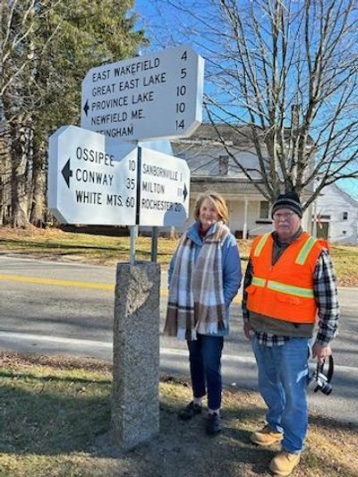 The new sign was constructed by JC Signs of Wolfeboro and installed on the original granite post under the direction of the Wakefield Heritage Commission. Shown in photo: Pam Wiggin, Chairman of the WHC and Phil Twombley, Vice Chairman.
